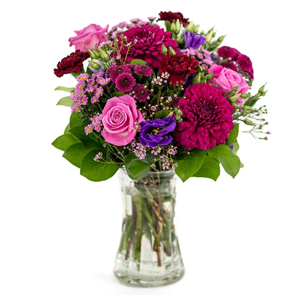 En farverig buket med dybe lilla, ceriserosa og bordeauxfarvede nuancer kombineret med sæsonens grønne. Perfekt når du vil overraske din kærlighed på Valentinsdag den 14. februar. Buketten er et eksklusivt stykke floristhåndværk, og blomsterne er nøje udvalgt for at sikre høj kvalitet. Hver buket er unik og bindes ud fra sortiment og sæson, men bevarer altid sin farve og form. Buketten leveres af en lokal florist.